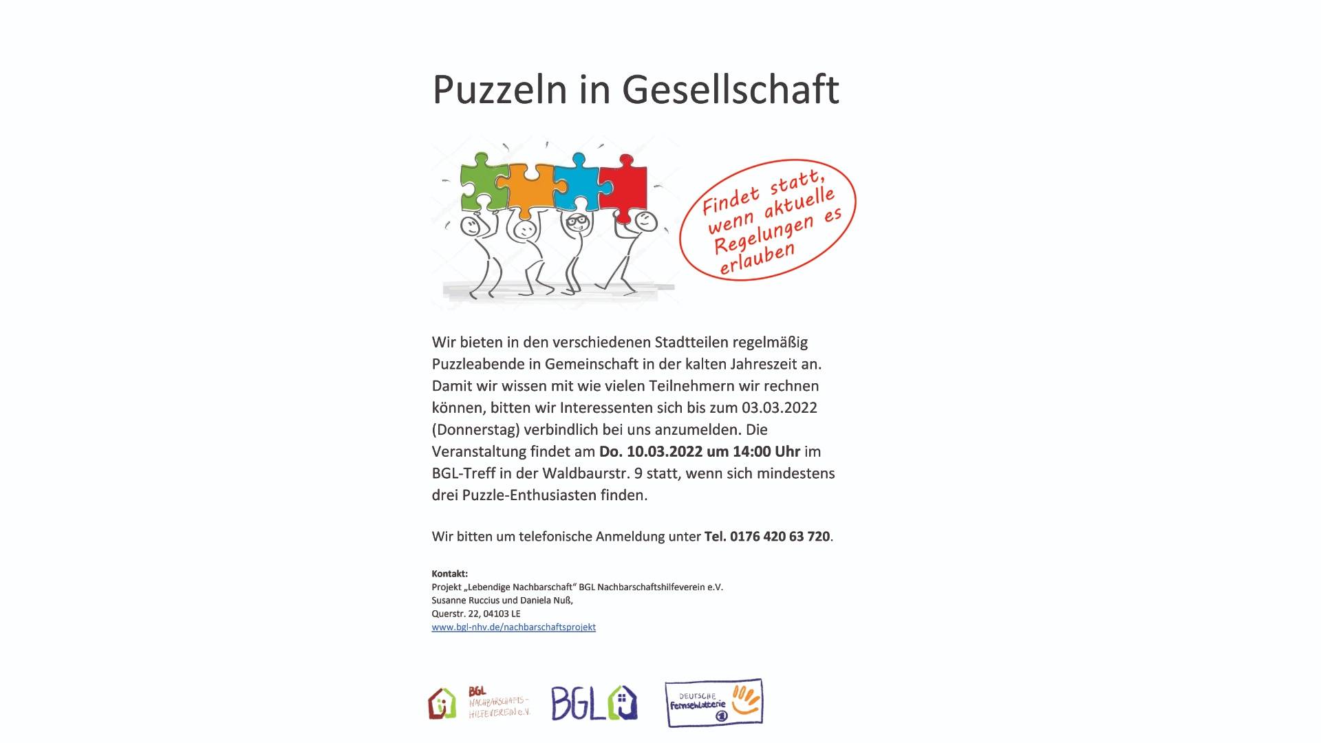 Wir bieten in den verschiedenen Stadtteilen 14-tägig Puzzleabende in Gemeinschaft in der kalten Jahreszeit an. Damit wir wissen, mit wie vielen Teilnehmenden wir rechnen können, bitten wir um telefonische Anmeldung. Die Veranstaltungen finden statt, wenn sich mindestens drei Puzzle- Enthusiast:innen finden. Erste Termine und Anmeldefristen: