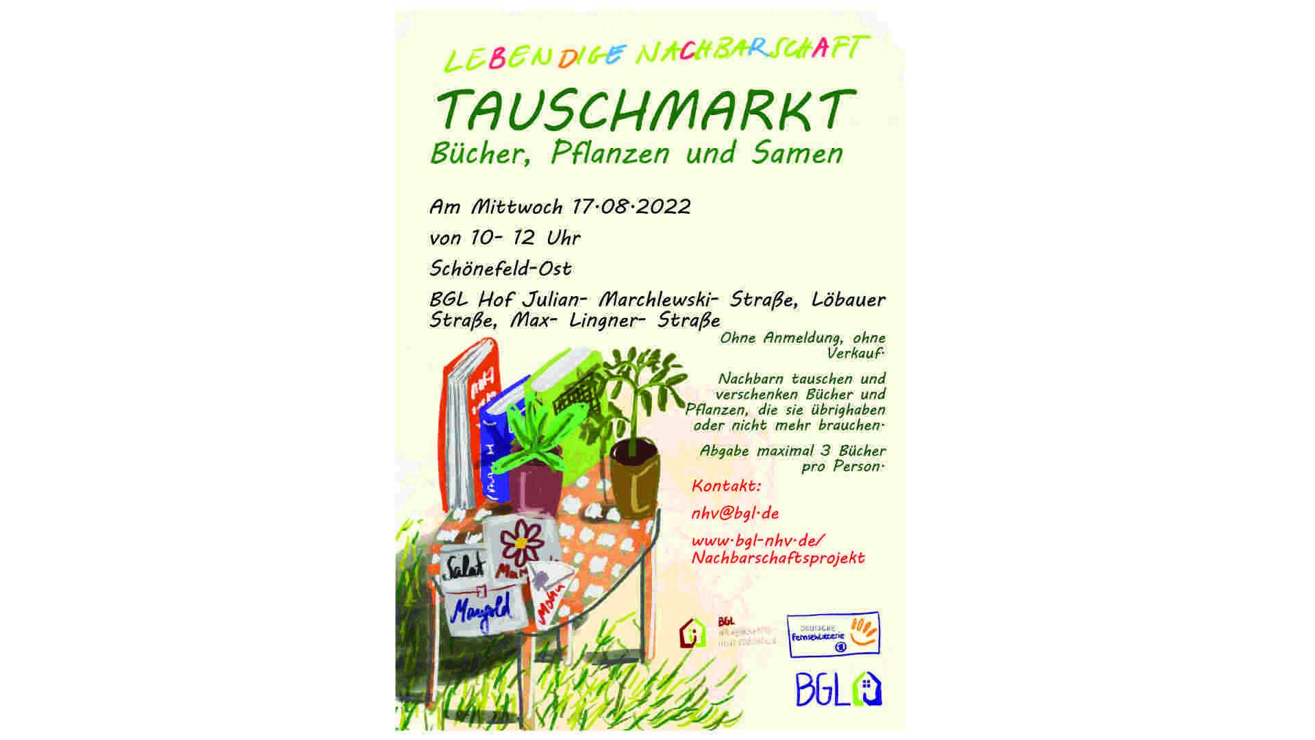 Der Sommer steht in voller Blüte, die Bücher im Garten sind bereits alle gelesen, es wird definitiv Zeit für neuen Lesestoff. Wir treffen uns zur 4. Buchtauschbörse in diesem Jahr und schauen, was die nachbarlichen Buchschränke so zu bieten haben. Wir bitten darum möglichst max. 3 Bücher zum Tauschen mitzubringen. Wer nichts zum tauschen hat, ist trotzdem herzlich eingeladen sich neuen Lesestoff auszusuchen.