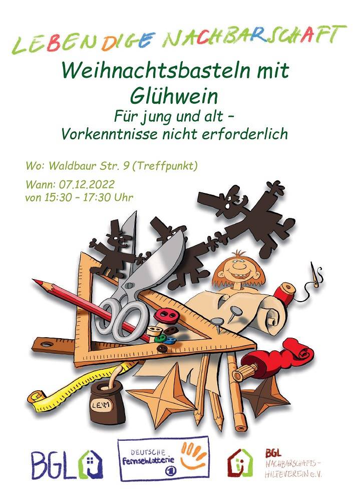 Langsam wird es Zeit sich um die Geschenke zu kümmern. Etwas selbst Hergestelltes kommt immer gut an! Aus diesem Grund verwandeln wir am Mi. den 07.12.2022 von 15:30 - 17:30 Uhr den Nachbarschaftstreff in der Waldbaurstr. 9 in Schönfeld in eine kleine Weihnachtsbasteleiwerkstatt. Damit dies aber nicht nur Anstrengung bedeutet, kredenzen wir natürlich Glühwein aber auch Kinderpunsch. Jung bis Alt ist willkommen und eingeladen mitzubasteln.