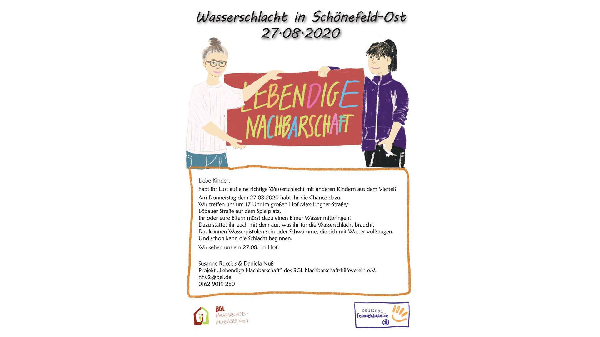 Die große Wasserschlacht von Schönefeld findet am 27.08.2020 um 17 Uhr statt. Sie dauert bis die Wasserreserven erschöpft sind. Die kleinen und großen Kämpfer sollen sich selbst mit Wasser und entsprechenden "Waffen" ausstatten, um an der großen Schlacht teilzunehmen. Wir treffen uns am Spielplatz Max-Lingner/ Löbauer Straße.