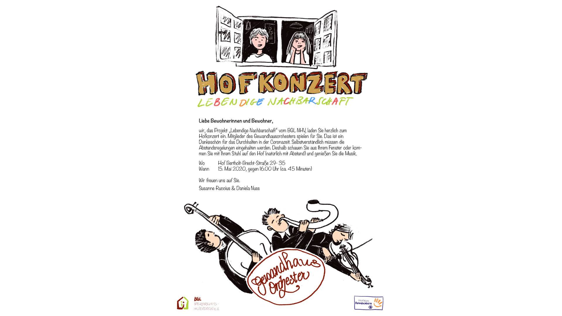 Das Projekt „Lebendige Nachbarschaft“ vom BGL NHV, lädtSie herzlich ein zum Hofkonzert.. Mitglieder des Gewandhausorchesters spielen für Sie. Das ist ein Dankeschön für das Durchhalten in der Coronazeit. Selbstverständlich müssen die Abstandsregelungen eingehalten werden. Deshalb schauen Sie aus Ihrem Fenster oder kommen Sie mit Ihrem Stuhl auf den Hof (natürlich mit Abstand) und genießen Sie die Musik.