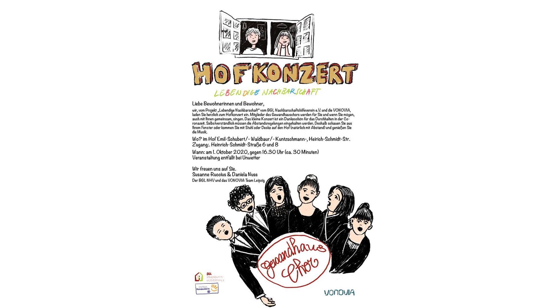 Das Projekt „Lebendige Nachbarschaft“ vom BGL NHV, laden Sie herzlich zum Hofkonzert ein. Mitglieder des Gewandhauschor singen für Sie. Selbstverständlich müssen die Abstandsregelungen eingehalten werden. Deshalb schauen Sie aus Ihrem Fenster oder kommen Sie mit Ihrem Stuhl auf den Hof und genießen Sie die Darbietung.