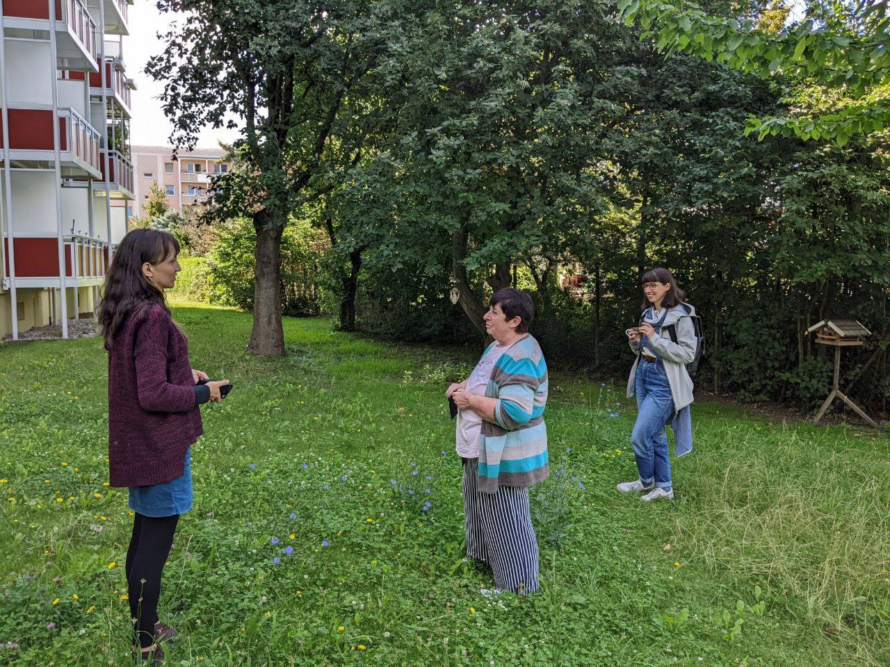Der Rundgang ging dann vor dem BGL-Block weiter, denn hier ist die Lage eine ganz andere: Dort regiert die direkte Sonneneinstrahlung und führt zu Hitze und Trockenheit auf den Wiesen. Auch hier hatte Henrike Barske einige Vorschläge, die nun mit den Anwohner:innen und der BGL diskutiert werden.